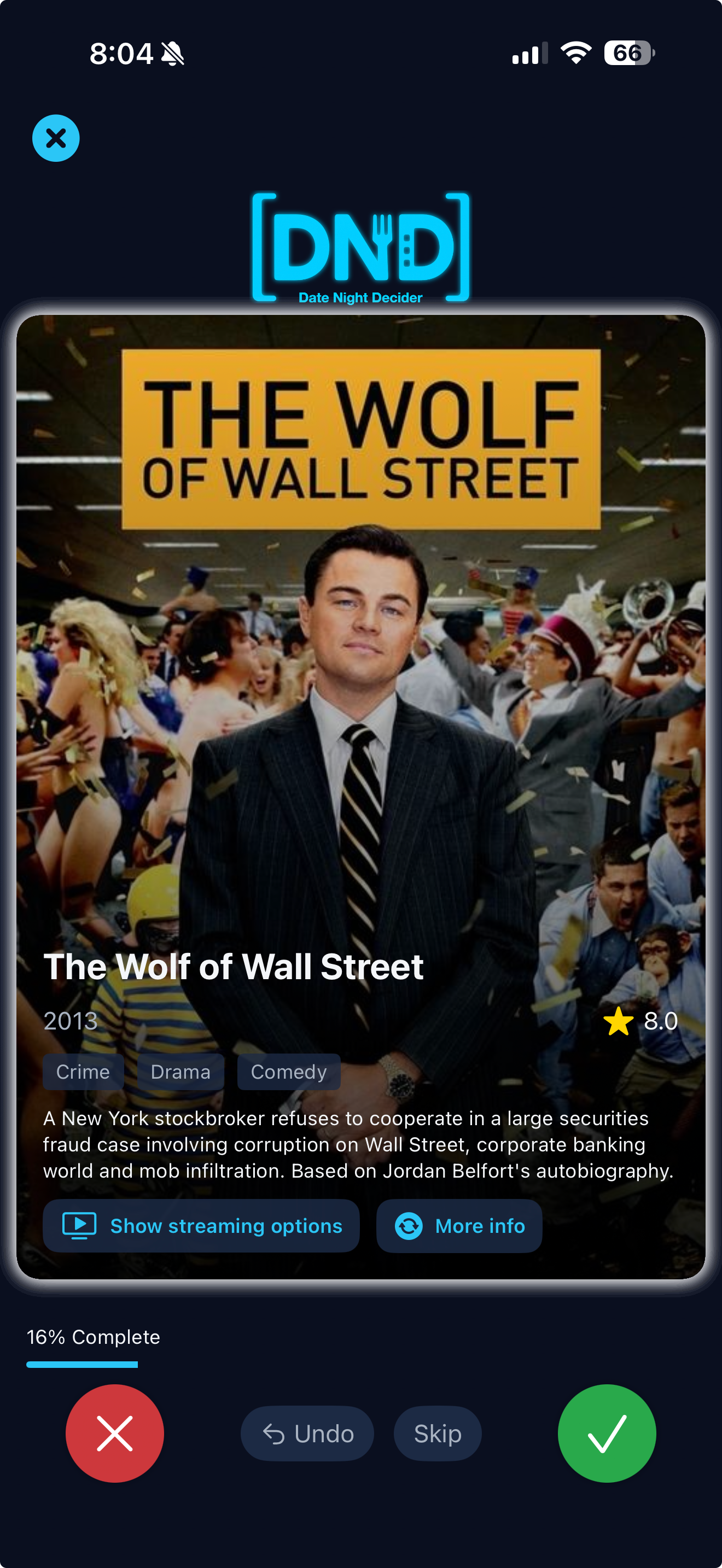 Set your genres, year range, and streaming services, then launch a session in seconds.